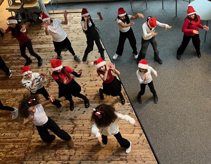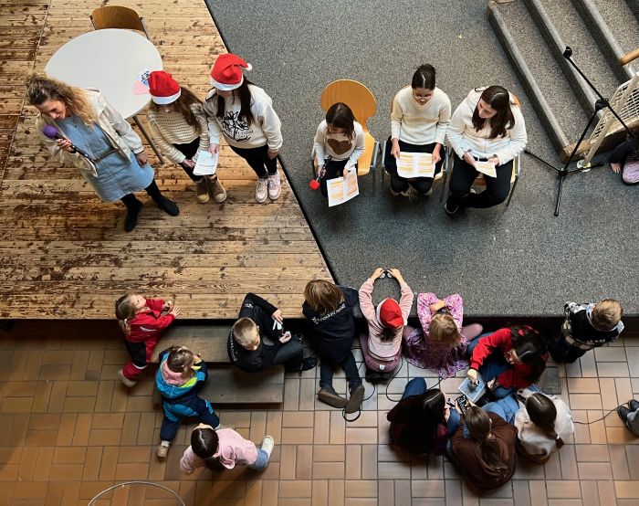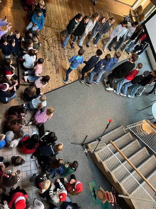 Die 5. Klassen zeigten ein kreatives, abwechslungsreiches Bühnenprogramm mit Weihnachtsliedern gespielt vom Blasorchester, Tänzen wie Bewegungsraps, Bodypercussion, einem Weihnachtsquiz, Lieder erraten mit Emojis und einer Weihnachtsgeschichte. Die Darbietungen boten eine tolle Mischung aus Musik, Bewegung und Schauspiel.